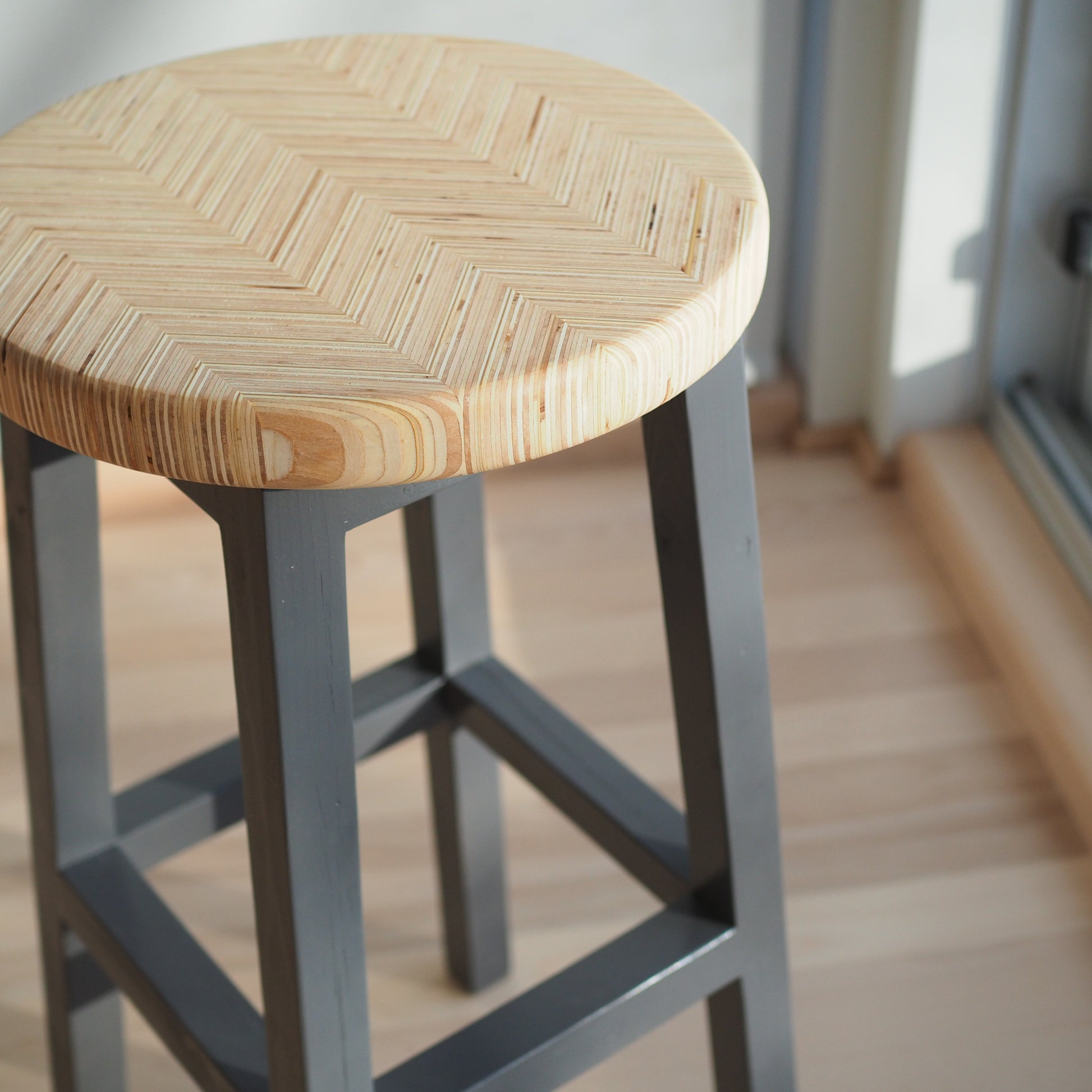 This counter height bar stool is a great woodworking project to practice compound angles and experiment with plywood patterns. Assembled using exclusively glue and dowels, so you won’t see any visible screws or hardware.